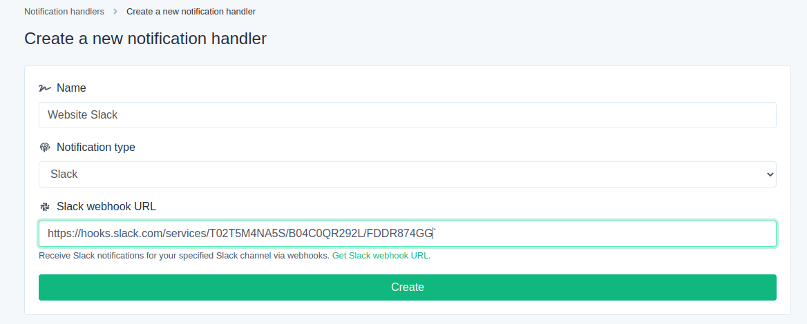 * Now, put in the **Name** and select **Slack** as **Notification type**. Paste the previously copied Slack Webhook URL in the **Slack Webhook URL** place holder and click on **Create.**