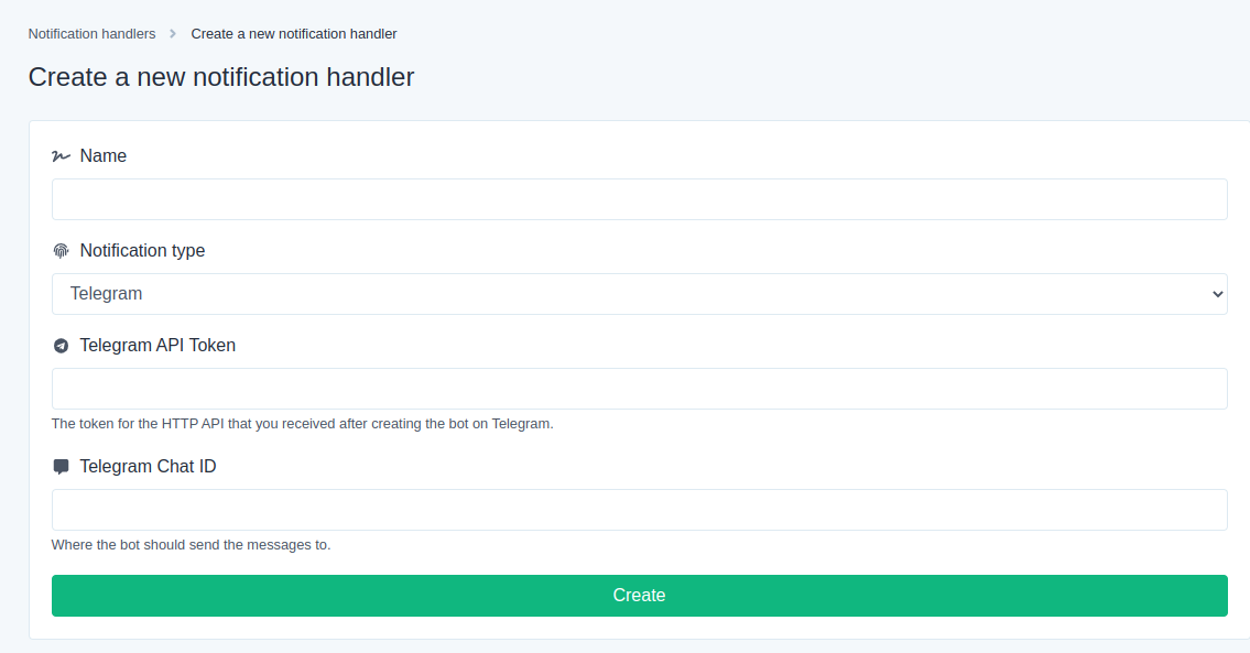 * Now, put in the **Name** and select **Telegran** as **Notification type**. Enter the **Telegram API token** for your bot and enter **Telegram Chat ID** for the group or chat where you want the notification sent.